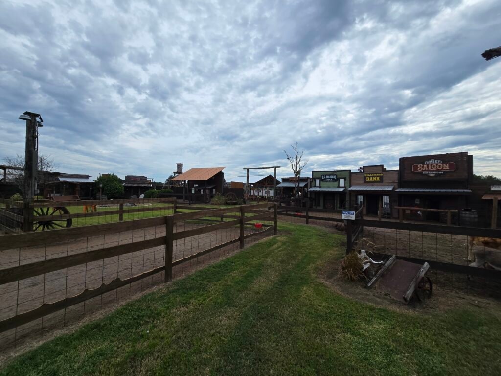 The weather was a pleasant mid-80s with partly cloudy skies. The farm is decorated in a western town theme, with wooden barn-style walls enclosing the petting zoo. Families can expect animals, playgrounds, shaded seating, and seasonal events.